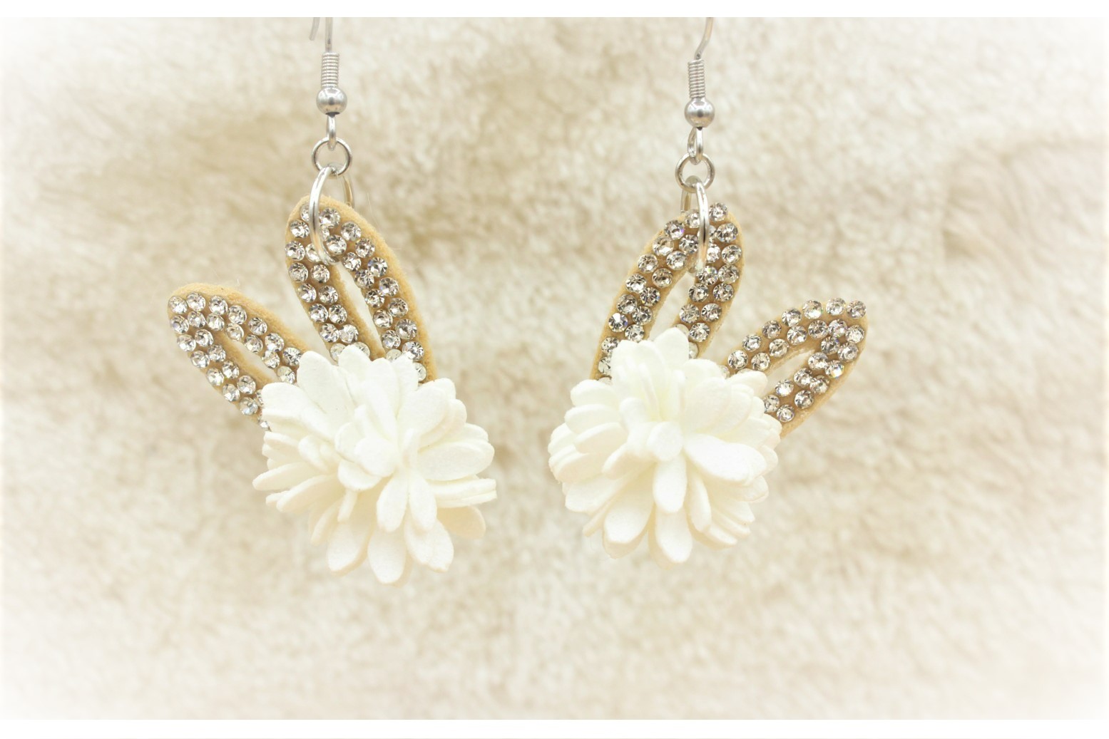 Easter Bunny Flower / Crystal Ear Earrings – 35 x 28mm. Faux sued flower. Crystal diamontes embellished faux suede ears. Size does not include earring components. Earrings on Stainless Steel Ear Hooks.