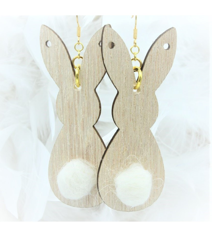 Easter Bunny With Tail Earrings – 80mm. Wooden Bunny with Pom Pom. Size – 80 x 30mm. Size does not include earring components. Earrings on Stainless Steel Ear Hooks.