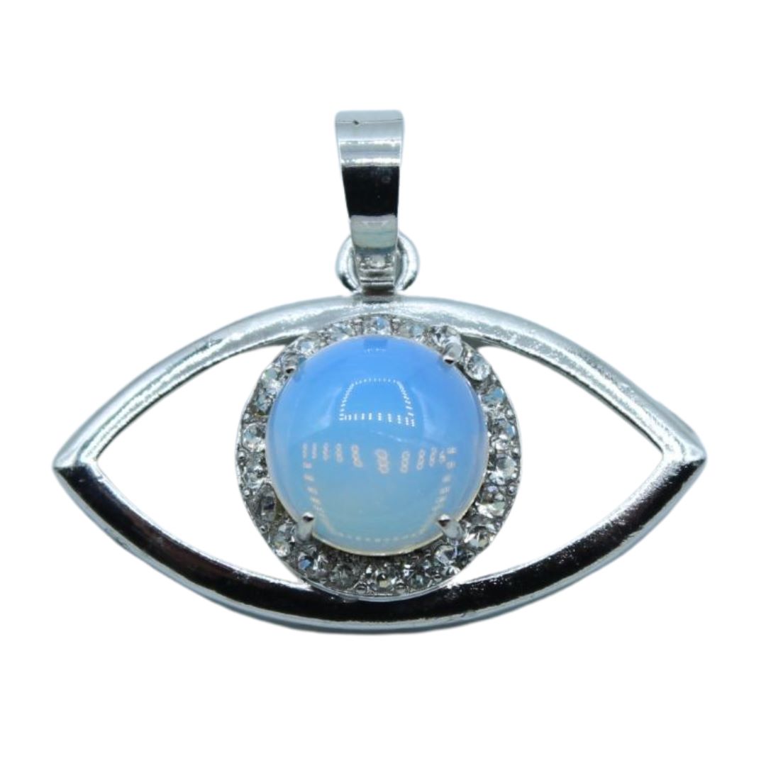 Eye Pendant / Syn Moonstone – 30mm. 30 x 15mm Eye pendant size. 10mm Round Cabochon surrounded by glass crystals. Syn Moonstone – Man made. Antique Silver colour pendant.