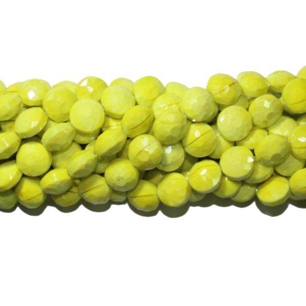 Faceted Coin – 14mm – Opaque Yellow – 31cm Strand. 14mm bead size. Please contact us to purchase individual pieces.