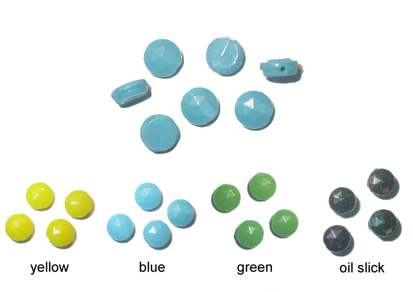 Faceted Coin – 4.5 x 3mm – Assorted Colours. Glass Bead. Made in the Czech republic. Hole drilled from side to side. Flat 1 side. Can mix colours to obatin quantity discount.