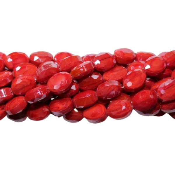 Faceted Oval – 16mm – Opaque Red – 39cm Strand. 16 x 12mm bead size. Please contact us to purchase individual pieces.
