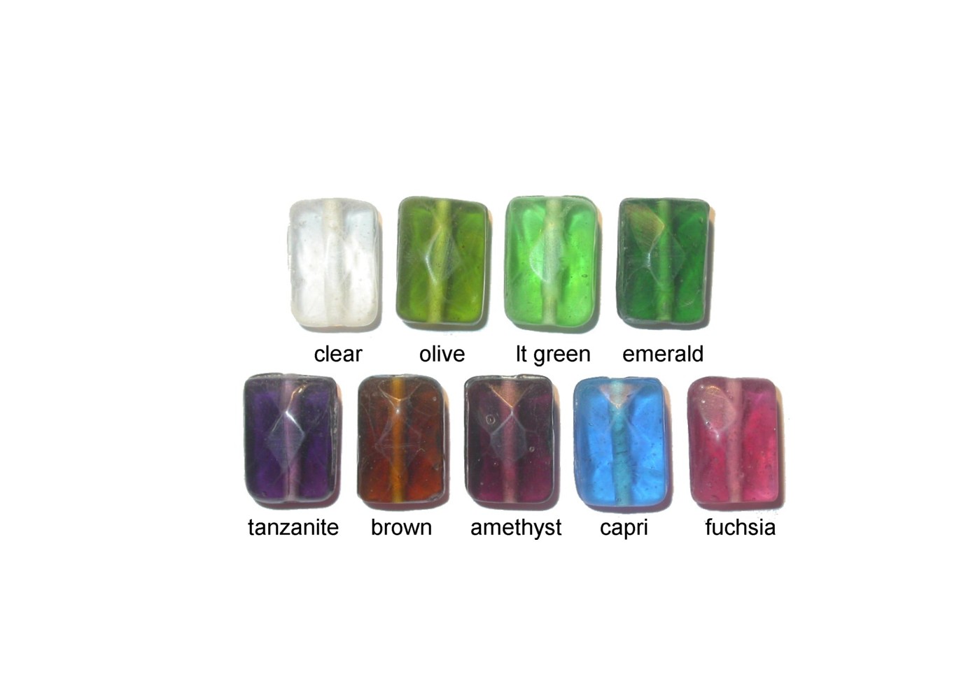 Faceted Rectangle – 17 x 12mm – Assorted Transparent Colours. Faceted Flat Rectangle. Blunt facet. Glass bead. Transparent colours. Can mix colours to obtain quantity discounts.
