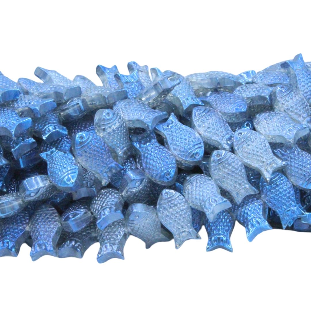 Fish Bead – 15 x 8mm – 84cm Strand – Metallic Blue.