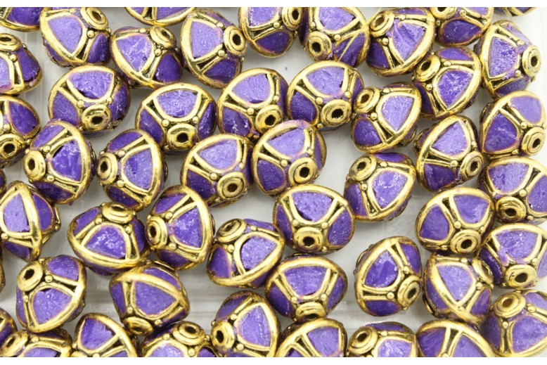 Flat Bicone Shape – 14 x 12mm – Antique Gold / Purple. Quality product. Metal Bead. Plated.