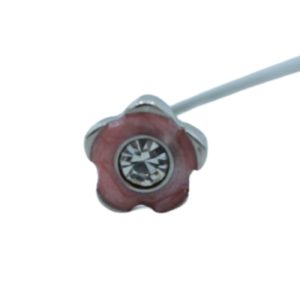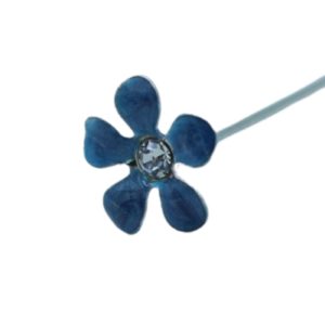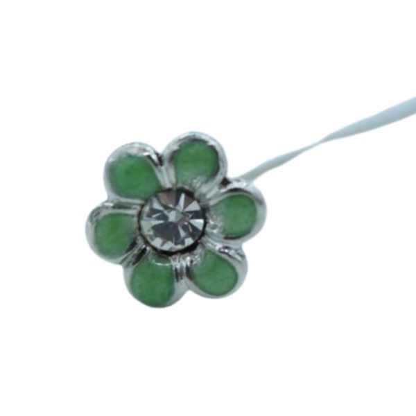 Floral Diamonte Pin – 70mm – A – Green / Antique Silver. 8mm Flower. Plated base metal.