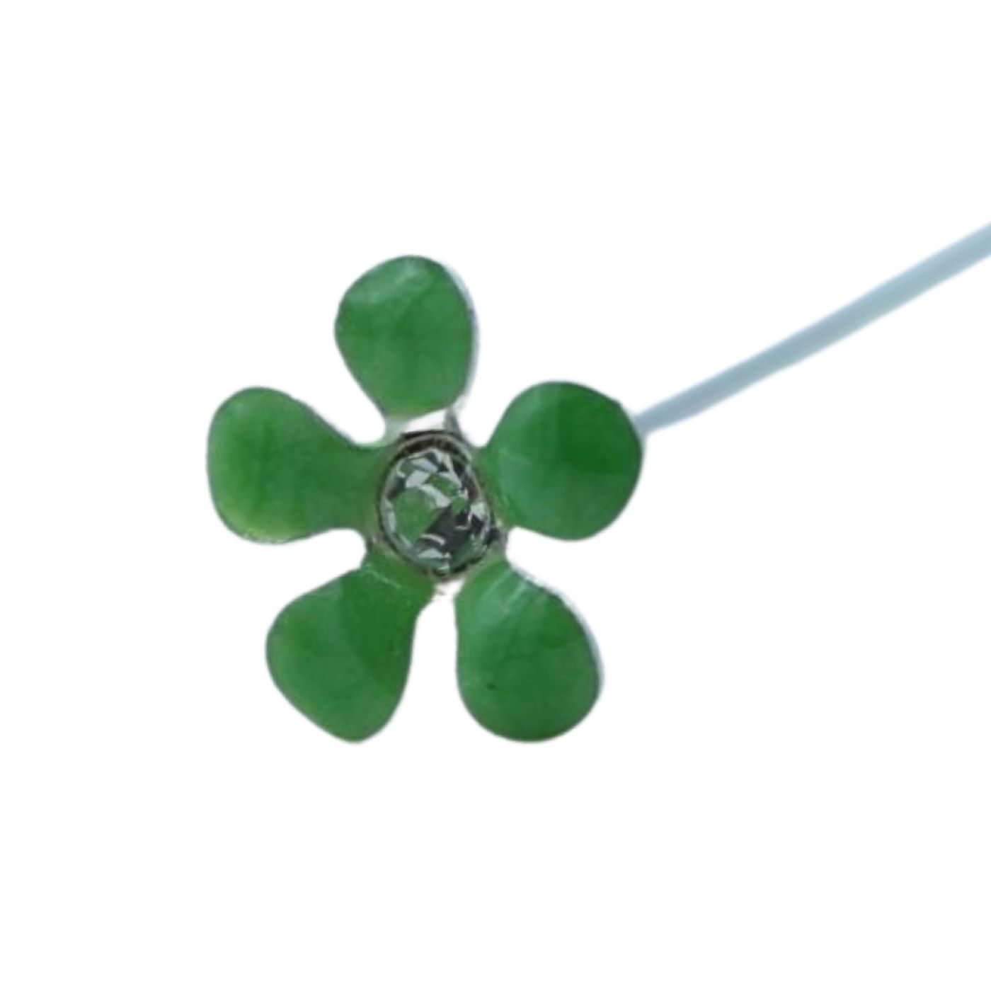 Floral Diamonte Pin – 70mm – Green / Antique Silver. 10mm Flower. Plated base metal.