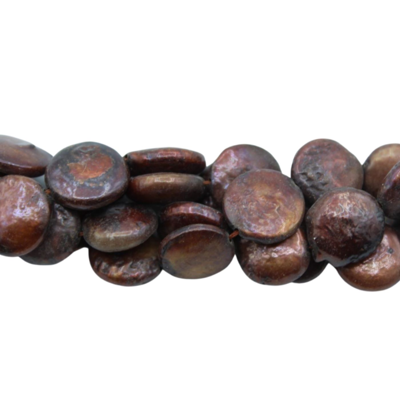 Freshwater Pearl – Coin – 10 – 12mm – 40cm Strand – Brown. Dyed Freshwater Pearl. Side drilled. Aprrox Size 10 – 12mm size.