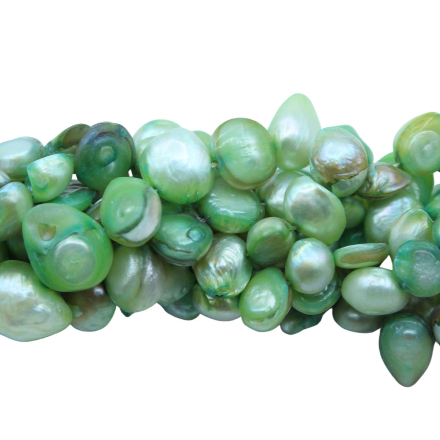 Freshwater Pearl – Dime – 8 – 14mm – 37cm Strand – Lt Green. Dyed Freshwater Pearl. Side drilled. Aprrox Size 8 – 14mm size.