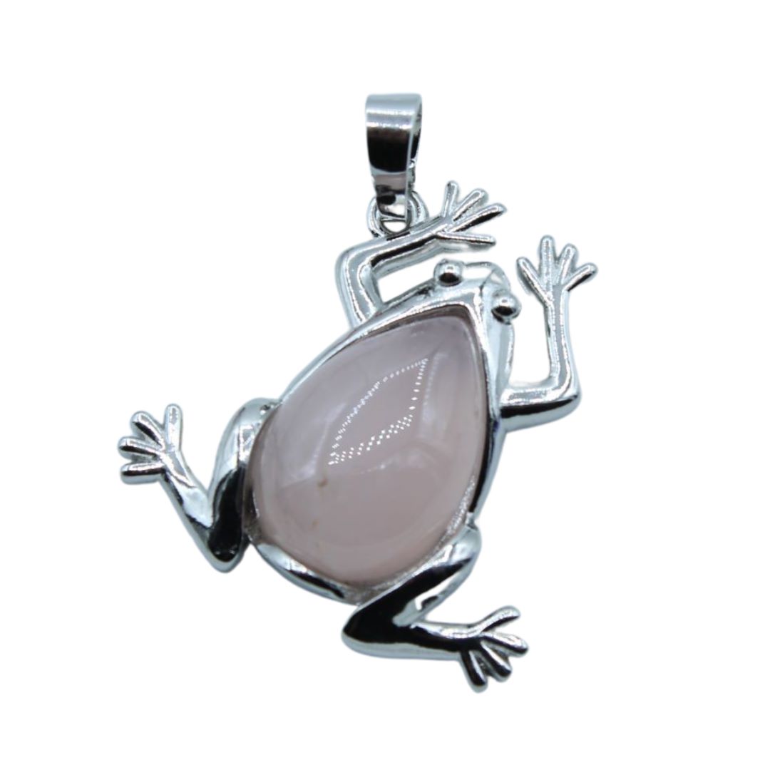 Frog Pendant / Rose Quartz – 30mm. 30mm Frog pendant size. 20 x 13mm Tear Drop Cabochon. Antique Silver colour pendant.
