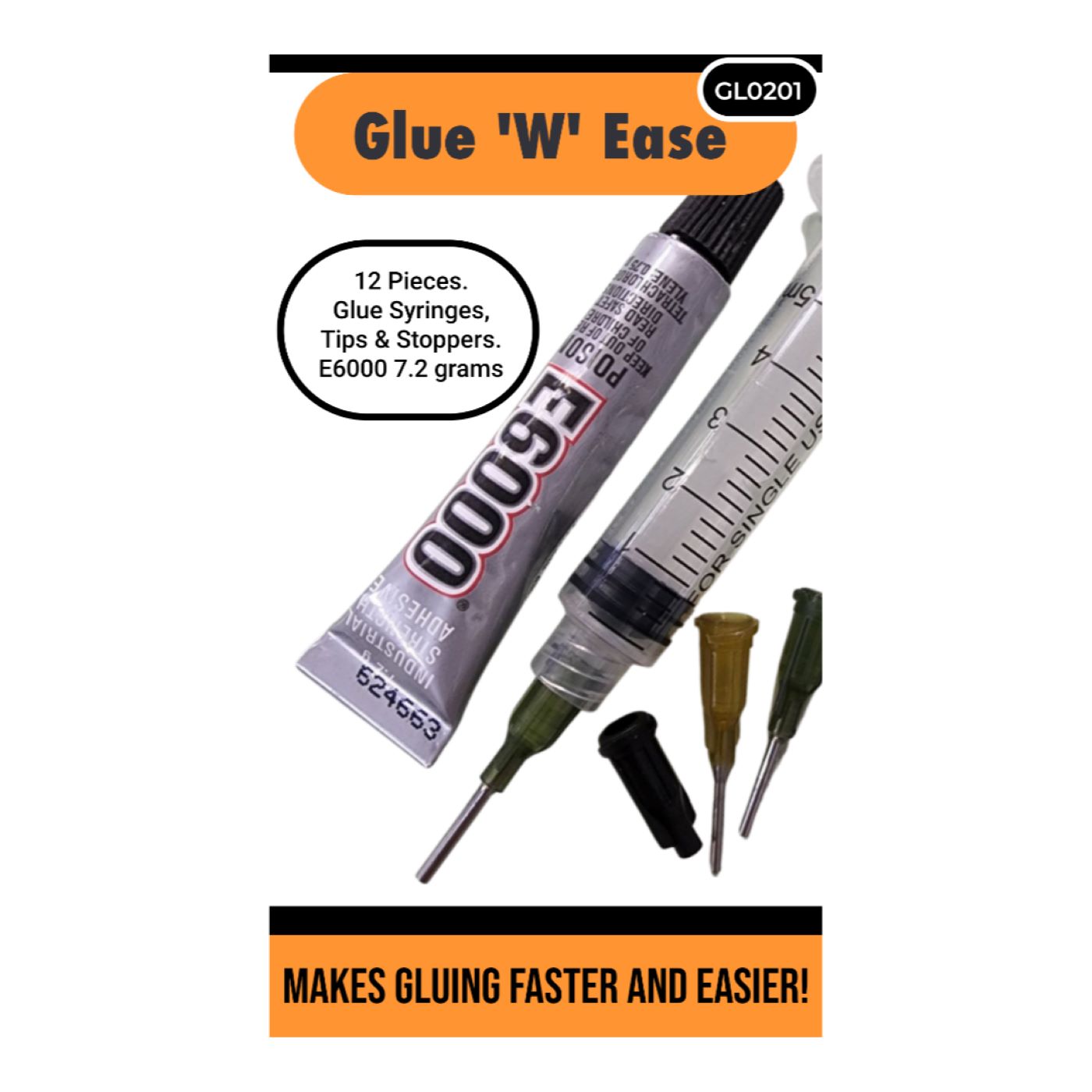 Glue ‘W’ Ease – Syringes, Tips, Stoppers & E6000 7.2gms. Makes Gluing faster and easier! Includes 5 x 5ml glue syringes, 2 x syringe caps / stoppers, 2 x 2.0mm / 14 gauge tips, 2 x 1.5mm / 17 gauge tips, E6000 – 7.2gms & basic instructions.