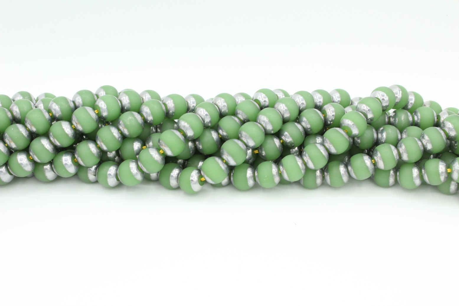 Green Opaque Matte / Silver – 10mm – 37cm. Glass Bead. 37cm strand. Metallic Silver capped on outside of bead.