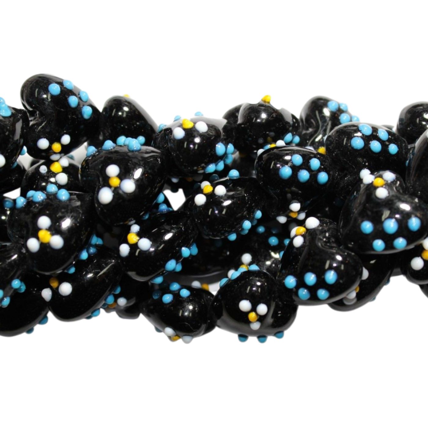 Heart With Spots – 20mm – 34cm Strand – Black. Glass bead. Please contact us to purchase individual pieces.