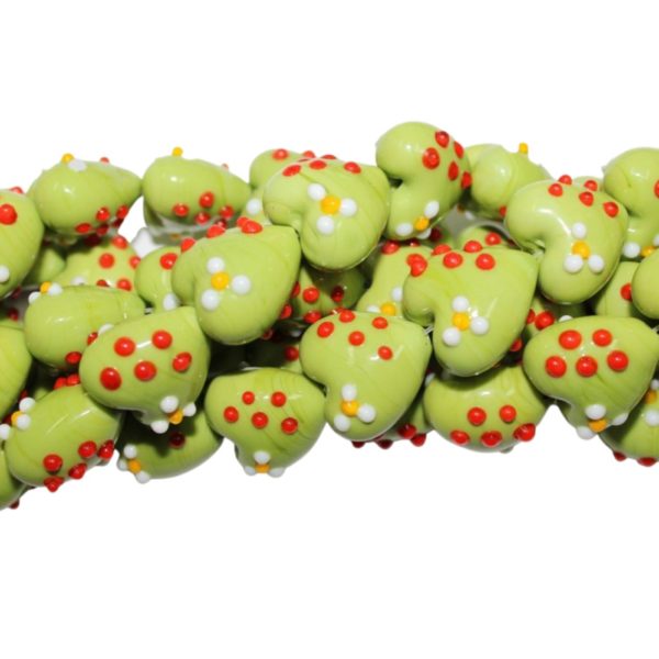 Heart With Spots – 20mm – 34cm Strand – Green. Glass bead. Please contact us to purchase individual pieces.
