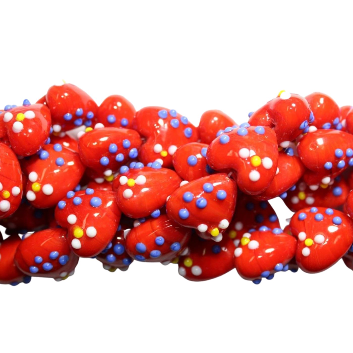 Heart With Spots – 20mm – 34cm Strand – Red. Glass bead. Please contact us to purchase individual pieces.