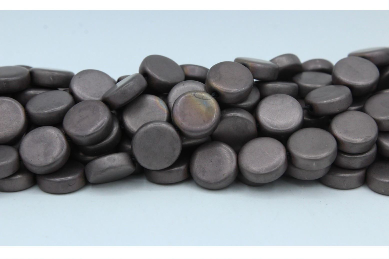 Hematite – 10mm Coin Shape – Brown – 40cm Strand. 10mm bead size. Plated Hematite.