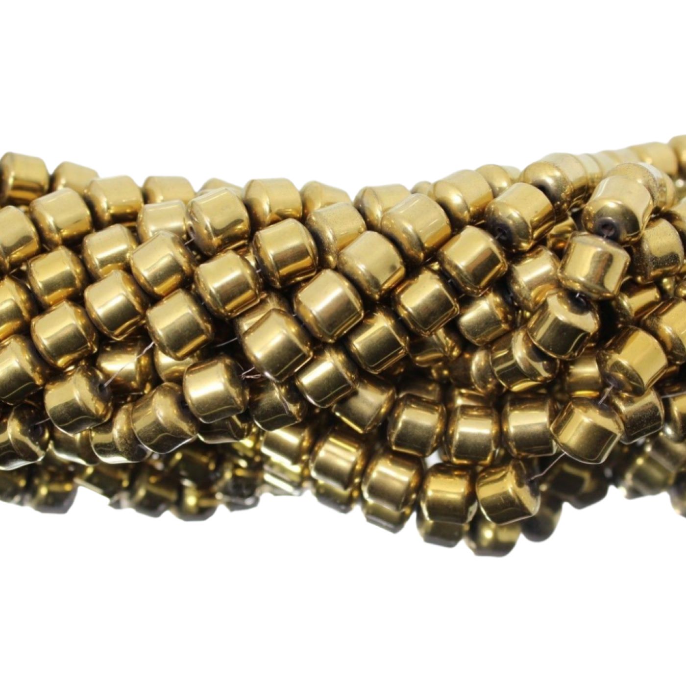 Hematite – 8mm Drum – Gold – 38cm Strand. 8 x 6mm bead size. Plated Hematite.
