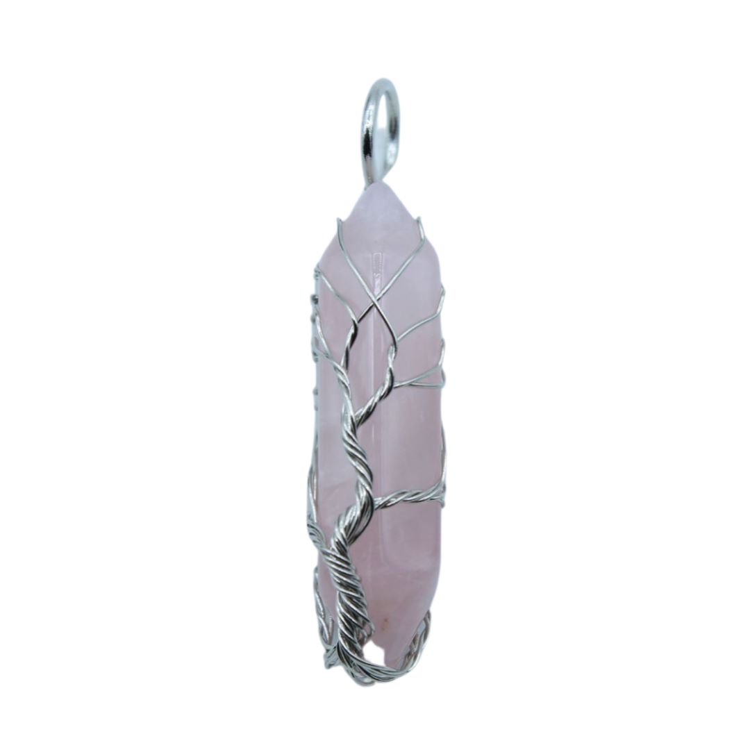 Icicle Pendant / Tree Of Life / Rose Quartz – 40mm.  40 x 12mm Drop pendant size.  Antique Silver wire colour.