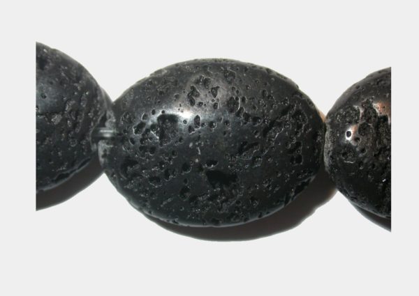 Lava Stone – Black – 22 x 16mm Flat Oval – 42cm Strand. Please contact us to purchase product by the piece.