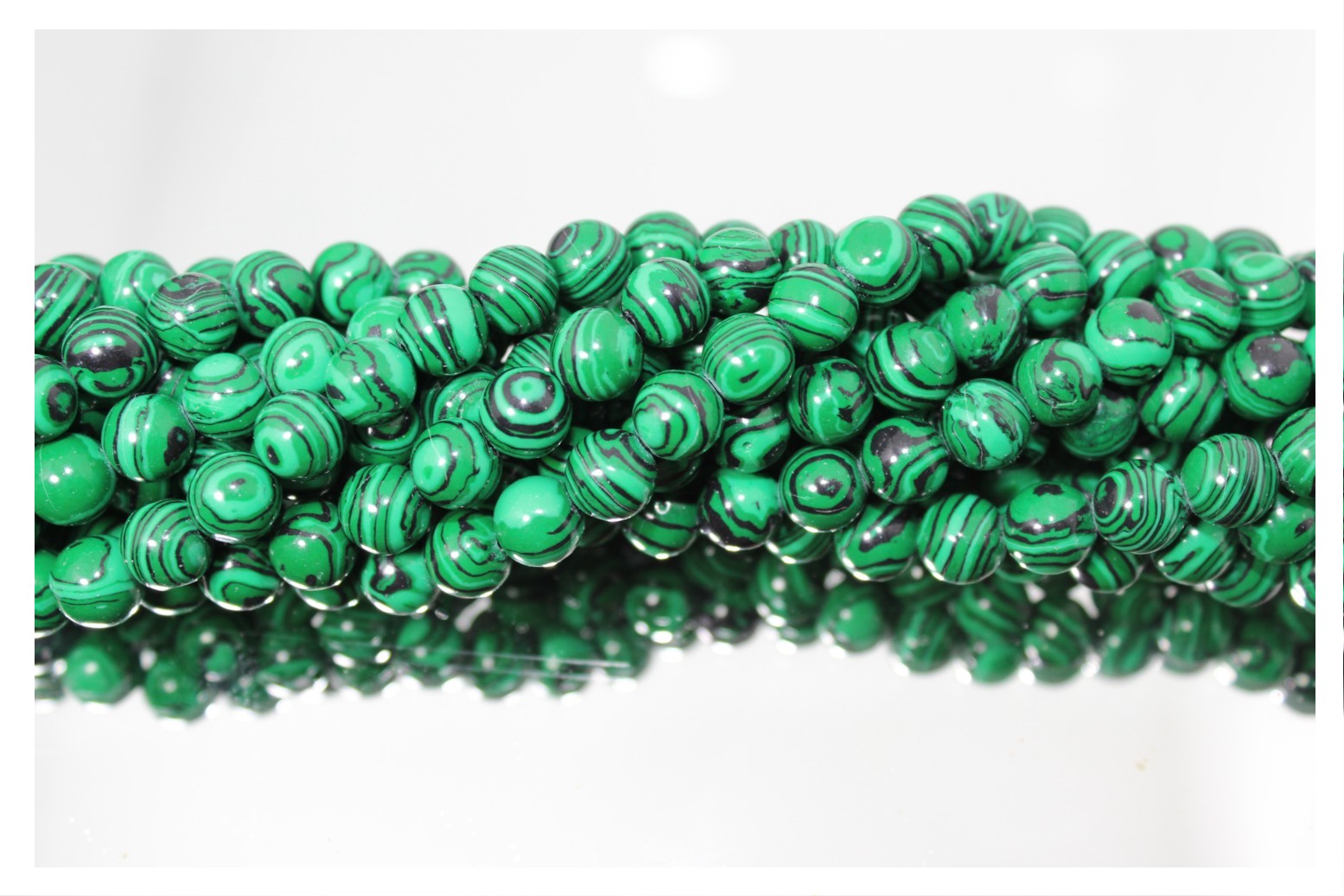Malachite Syn – 12mm Round – 39cm Strand. 12mm bead size. Please contact us to purchase individual pieces.