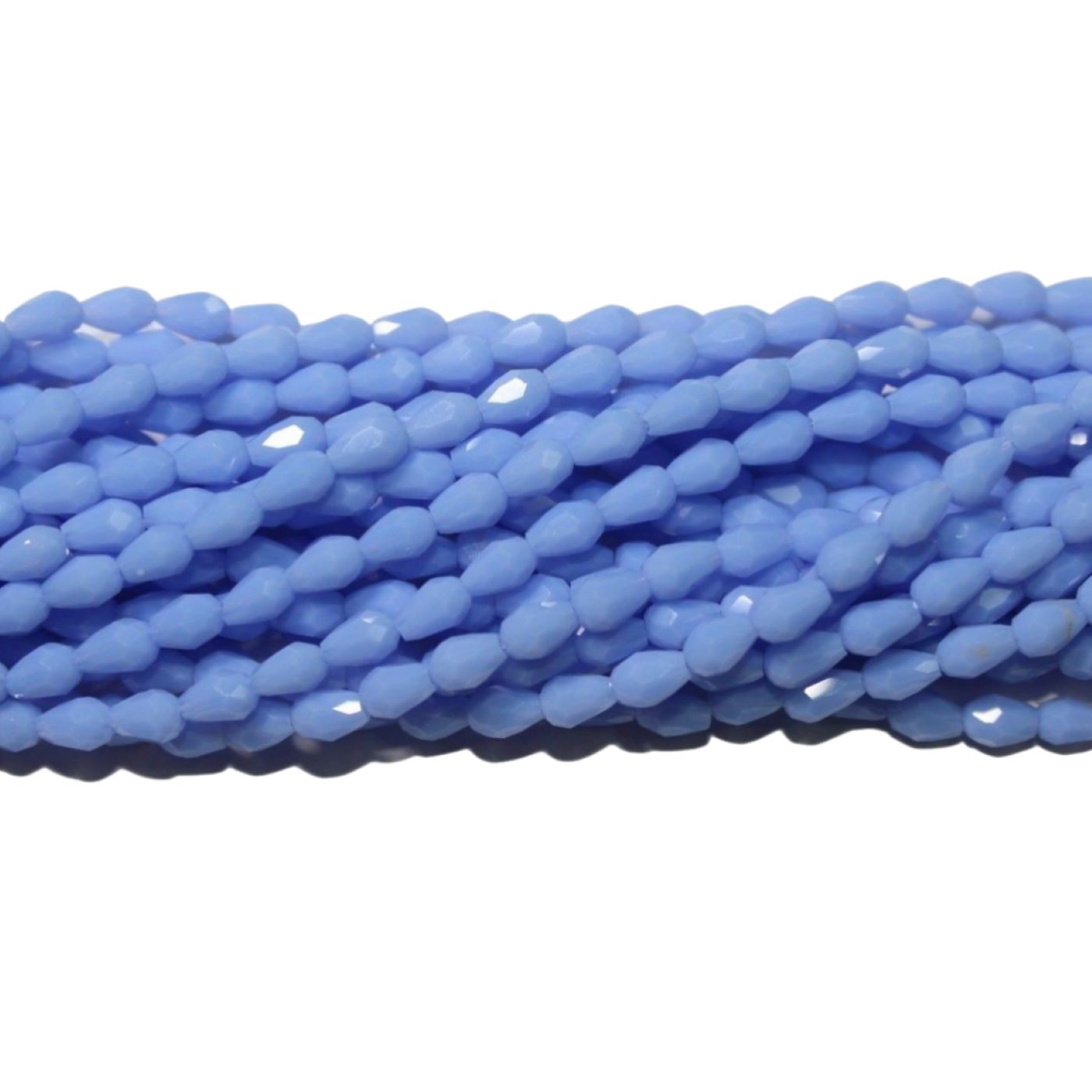 Mini Drop – 6mm – Faceted – Light Blue – 46cm Strand. 6 x 4mm bead size. Faceted drop glass bead. Please contact us to purchase individual pieces.