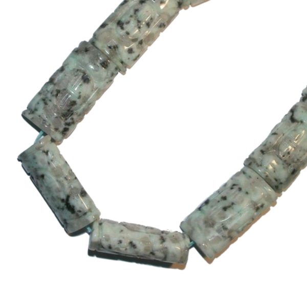Moss Jasper Carved Flat Barrel – 41cm Strand. 38 x 20mm Bead Size. Carved design on each bead. Please contact us to purchase individual pieces.