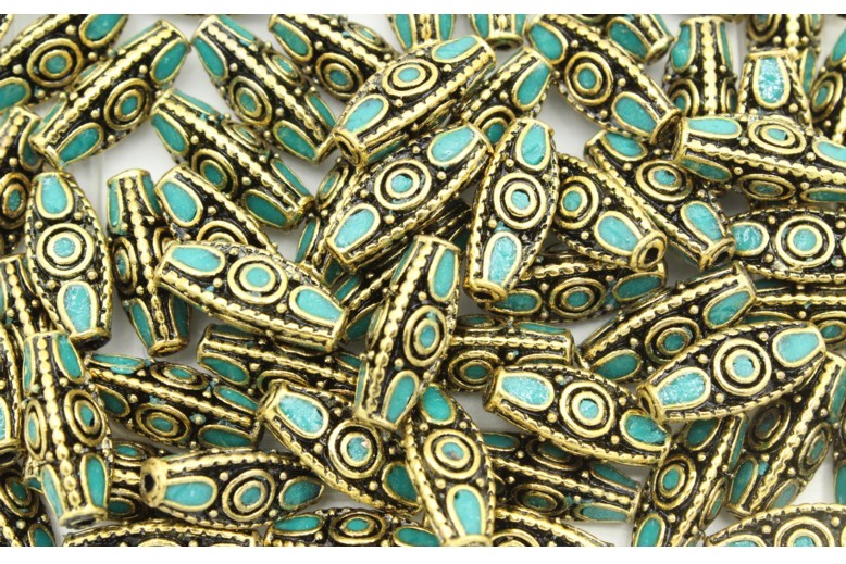 Navette Shape – 18 x 8mm – Antique Gold / Teale. Quality product. Metal Bead. Plated.