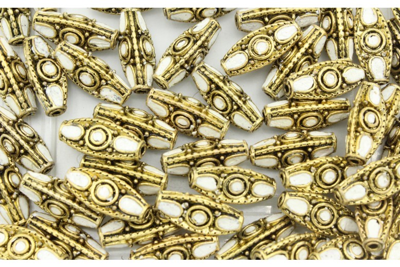 Navette Shape – 18 x 8mm – Antique Gold / White. Quality product. Metal Bead. Plated.