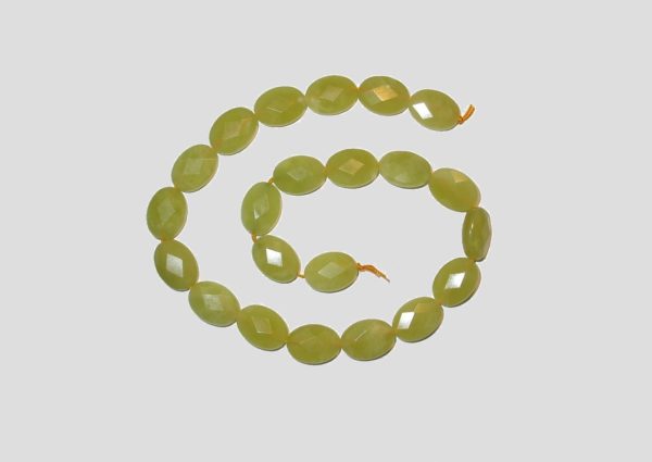 Olive Quartz Faceted Flat Oval – 40cm Strand. 20 x 14mm Bead size. Please contact us to purchase individual pieces.