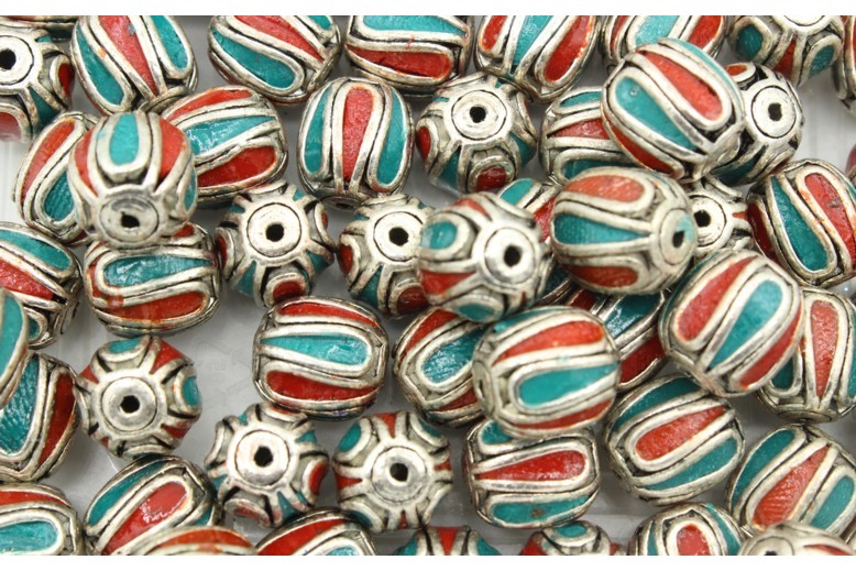Oval – 12 x 10mm – Antique Silver / Red / Teale. Quality product. Metal Bead. Plated.