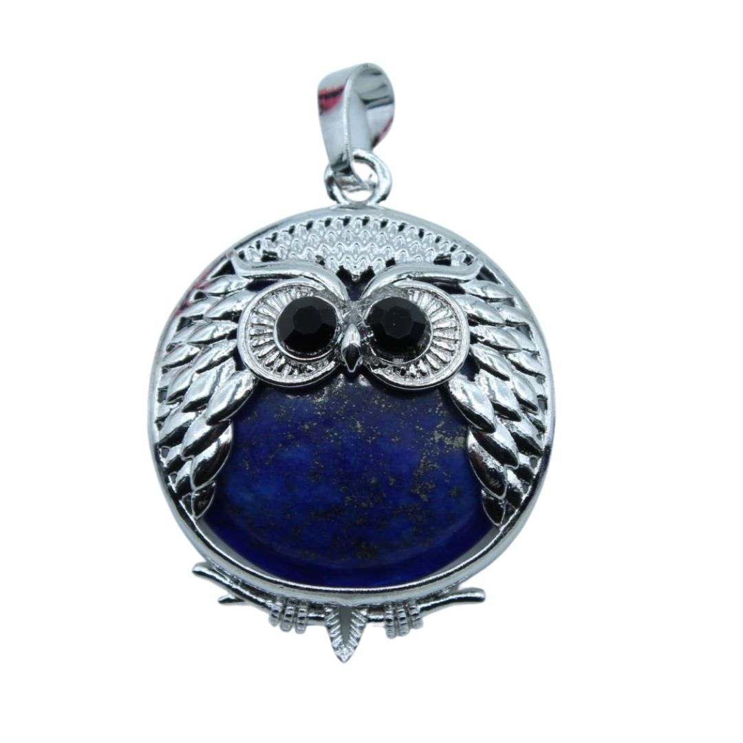 Owl Pendant / Lapis – 30mm. 30mm Owl pendant size. Faceted Glass Crystal Eyes. Lapis – Dyed Colour. Antique Silver colour pendant.