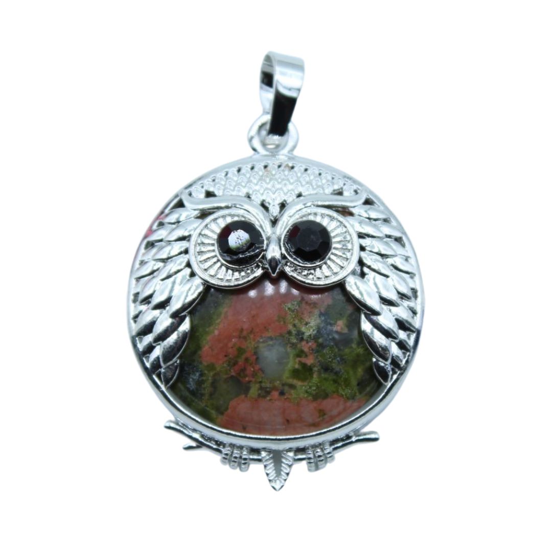 Owl Pendant / Unakite – 30mm.  30mm Owl pendant size. Faceted Glass Crystal Eyes.  Antique Silver colour pendant.