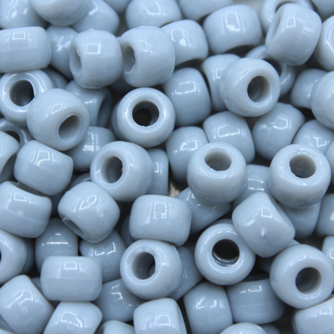 Pony Beads – 9mm – Grey – Opaque – ‘A’ Quality. Opaque Colour. Plastic beads. 9 x 6mm size. 3.5mm Hole Size.  Excellent quality. Made in the USA.