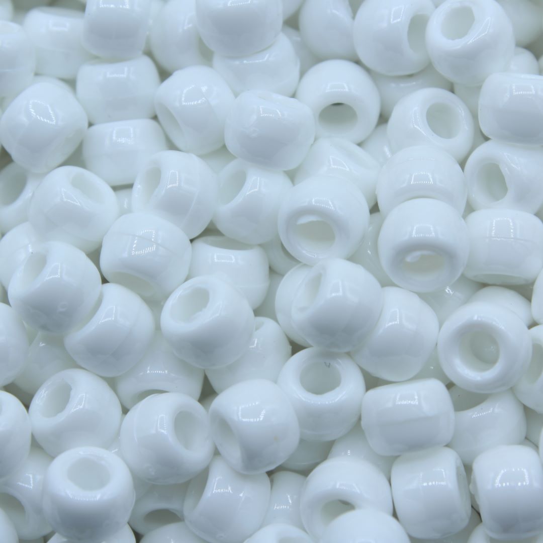 Pony Beads – 9mm – White – Opaque – ‘A’ Quality. Opaque Colour. Plastic beads. 9 x 6mm size. 3.5mm Hole Size. Excellent quality. Made in the USA.