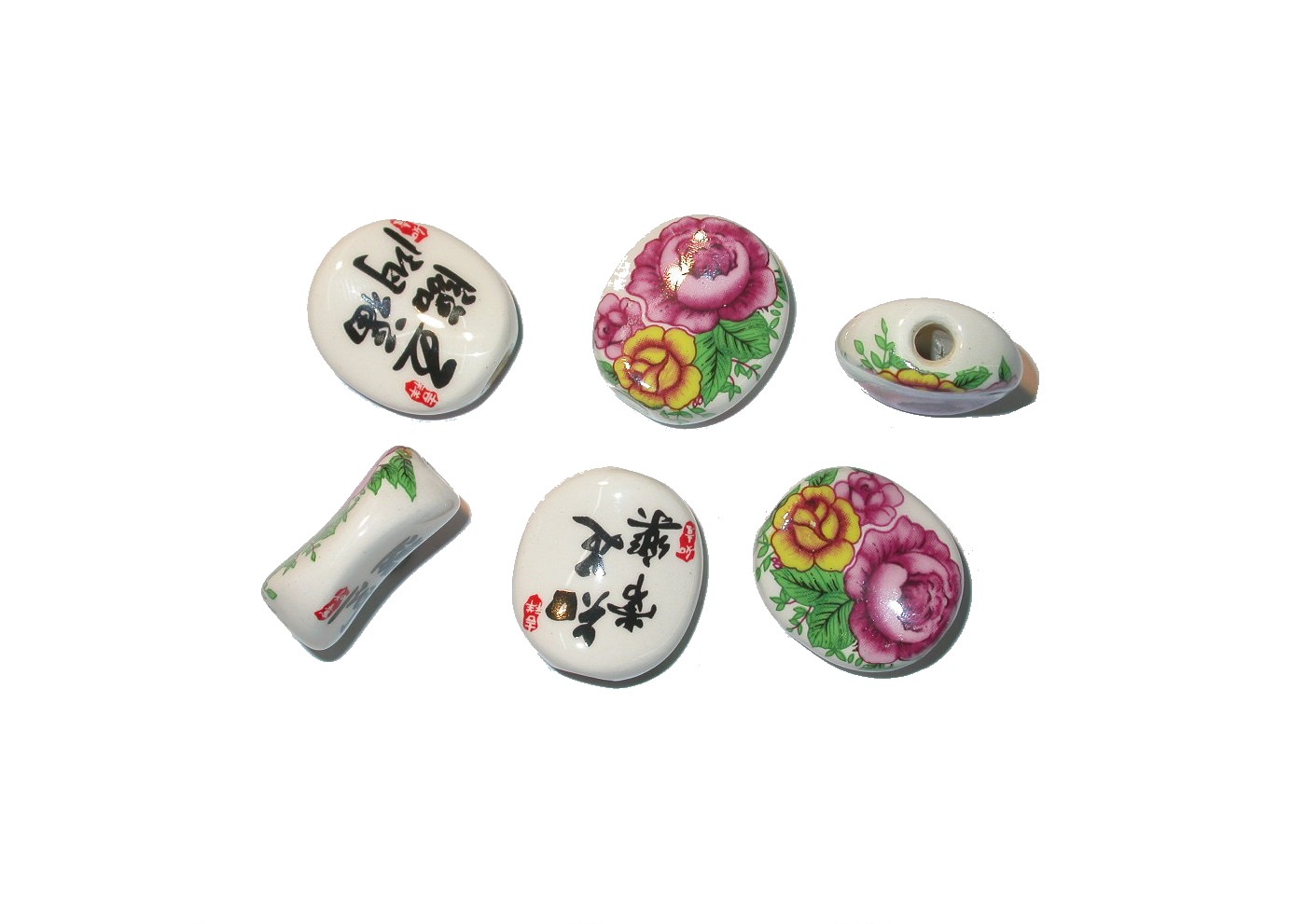 Porcelain Flat Oval – 26mm. Assorted Chinese writing on one side. 4mm Hole size. Floral pattern.