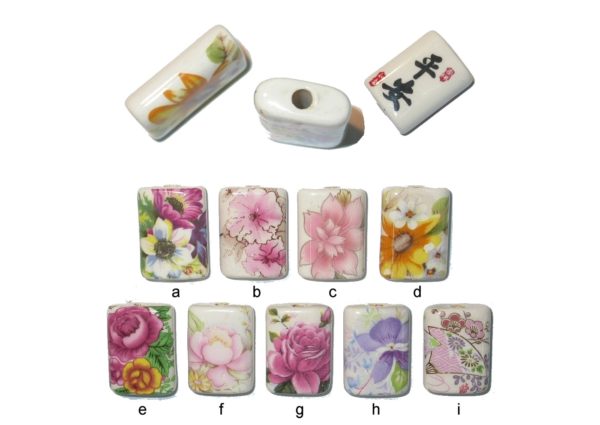 Porcelain Flat Rectangle – 27 x 20mm. 9mm Deep. Floral pattern one side & Chinese writing other side. 4mm Hole size.