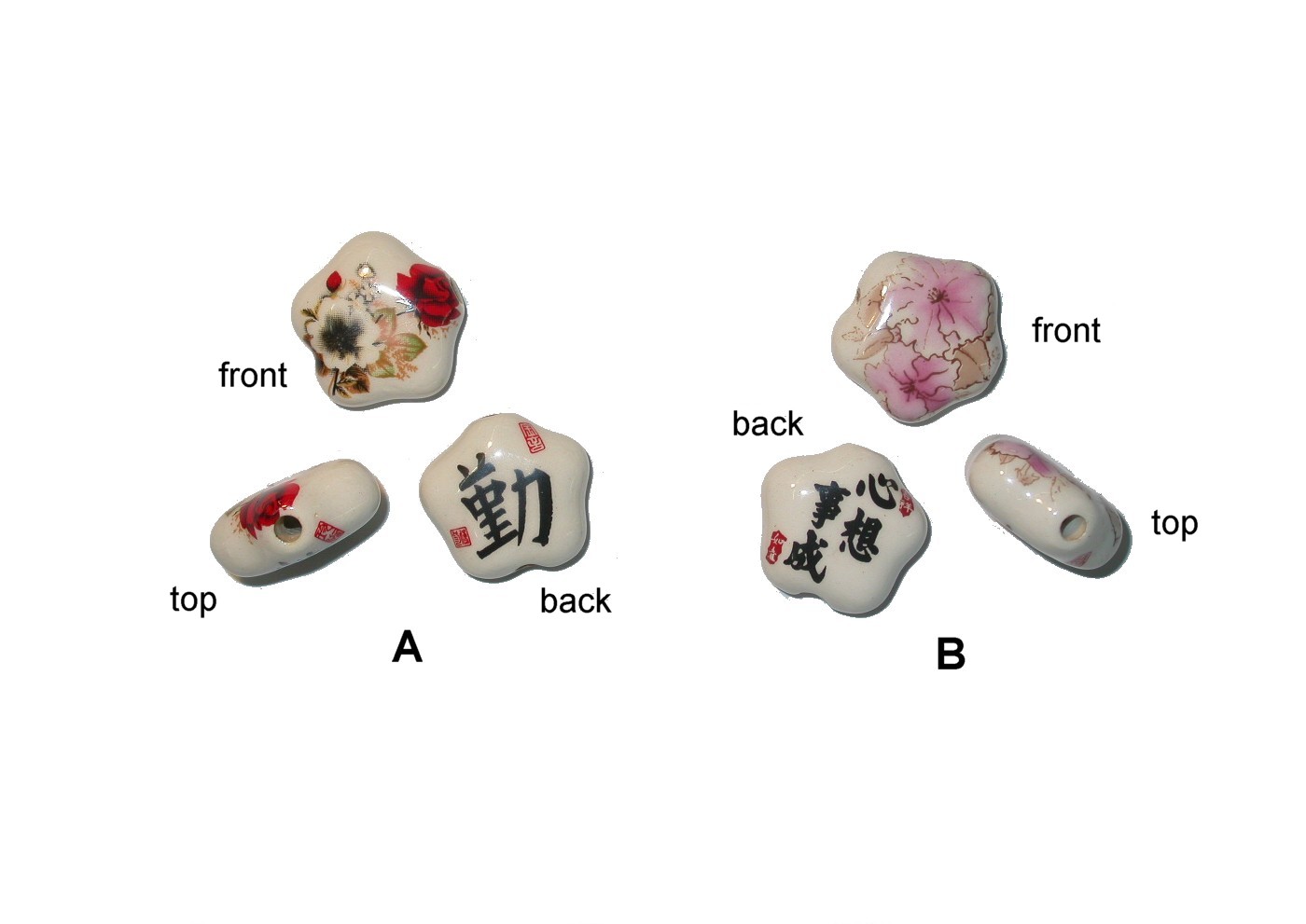 Porcelain Flower – 26mm. 10mm Thick. Assorted Chinese writing on one side. 4mm Hole size. Pentagon shape. Floral pattern.