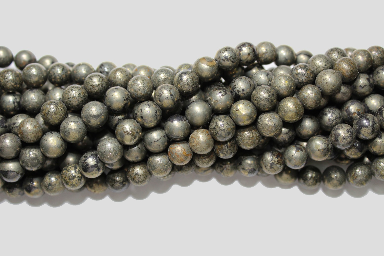 Pyrite – 10mm Round – 38cm Strand. 10mm bead size. Please contact us to purchase individual pieces.