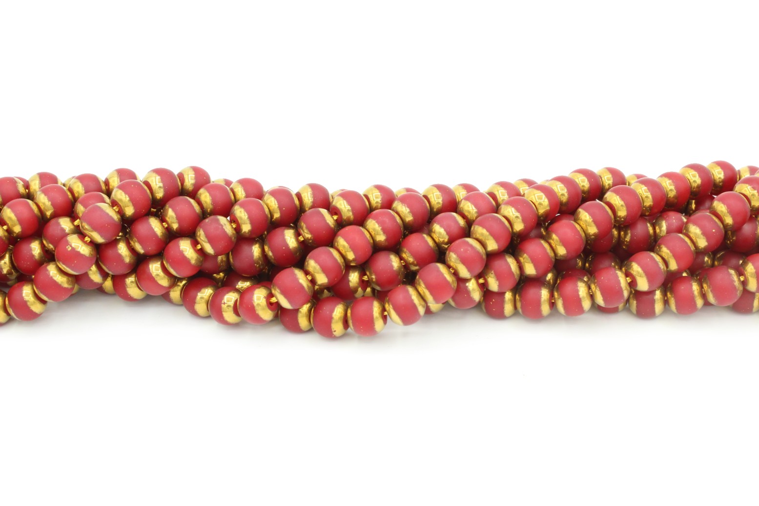 Red Opaque Matte / Gold – 10mm – 37cm. Glass Bead. 37cm strand. Metallic Gold capped on outside of bead.
