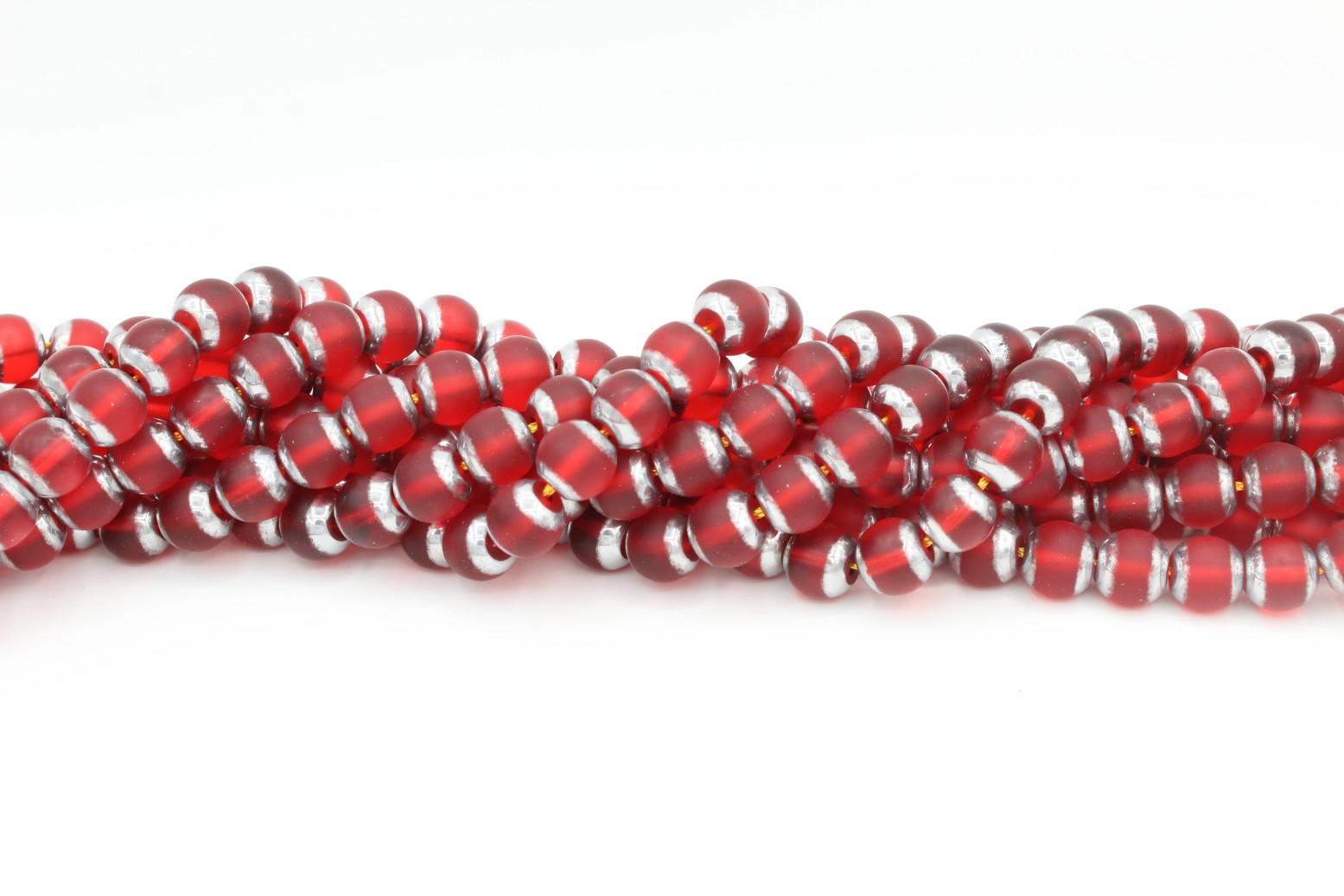 Red Opaque Matte / Silver – 10mm – 37cm. Glass Bead. 37cm strand. Metallic Silver capped on outside of bead.
