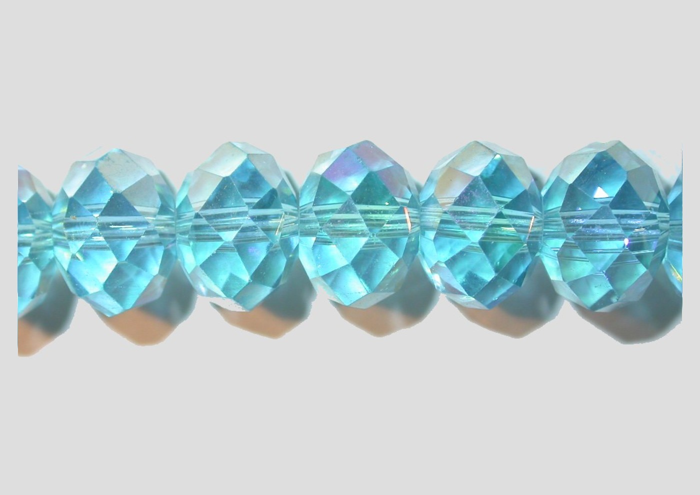 Rondelle – Faceted – 12 x 8mm – Aqua AB – 60cm Strand. Glass bead. Please contact us to purchase individual pieces. 60cm extra long strand!