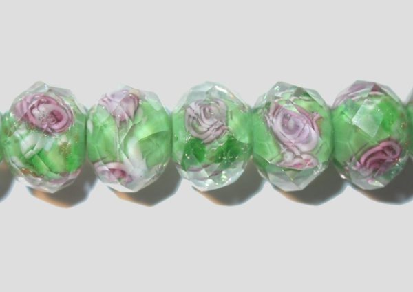 Rondelle – Floral Faceted – 12mm – Green – 16cm Strand. 12 x 8mm size. Glass bead. Please contact us to purchase individual pieces.