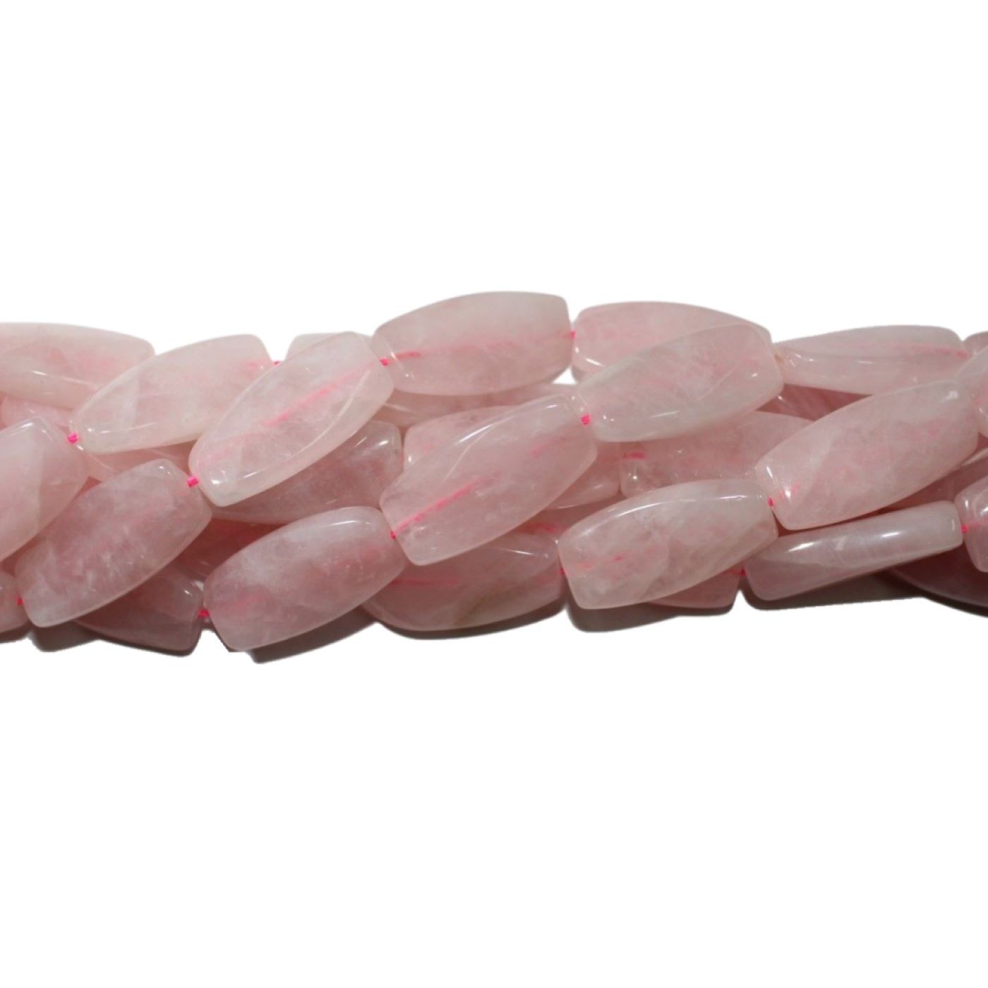 Rose Quartz – Twisted Flat Barrel – 30mm – 39cm Strand. 30 x 15mm bead size. Please contact us to purchase individual pieces.