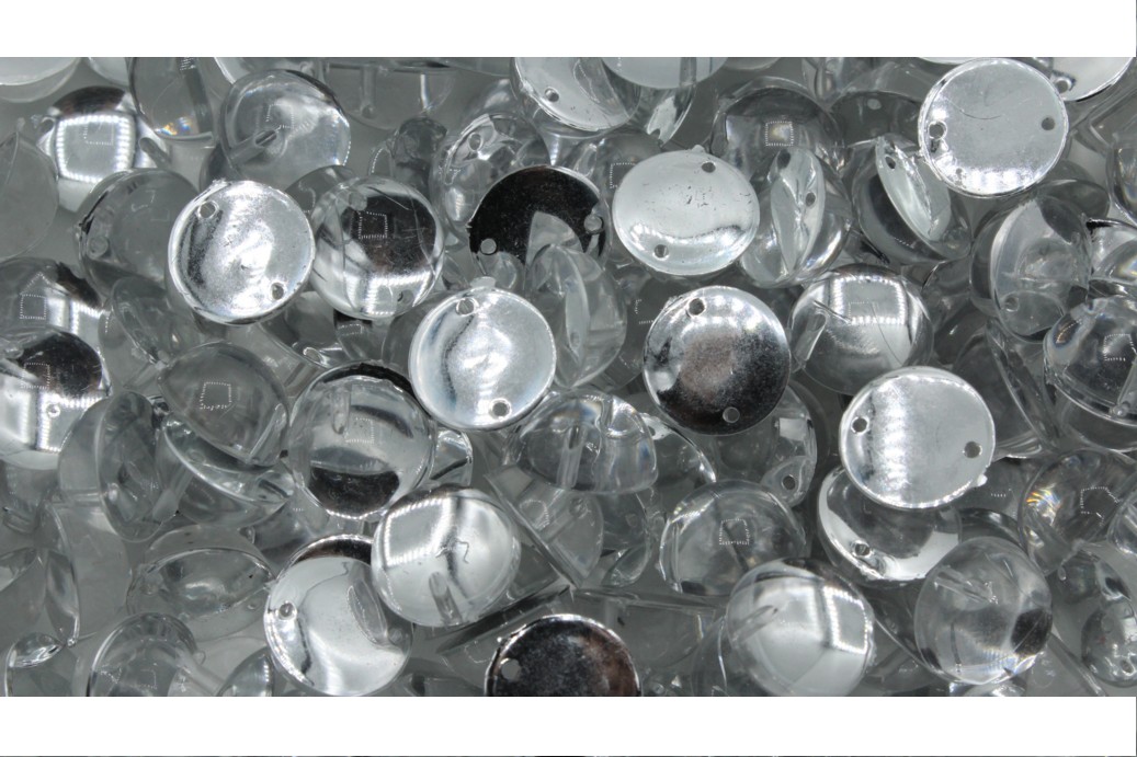 Round Cabachon – 12mm – Clear. Smooth top. 2 Holes. Plastic.