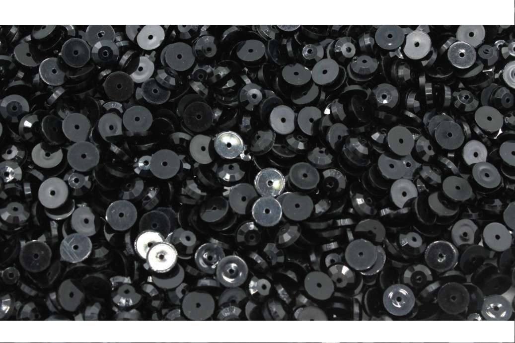 Round – CH – 5mm – Black. Silver back. Center Hole. 1 Hole. Plastic.
