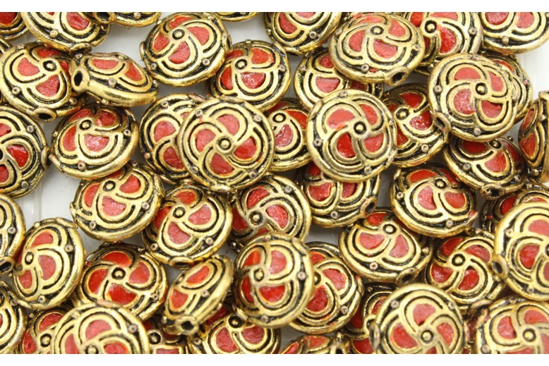 Saucer Shape – 15mm – Antique Gold / Red. Quality product. Metal Bead. Plated.