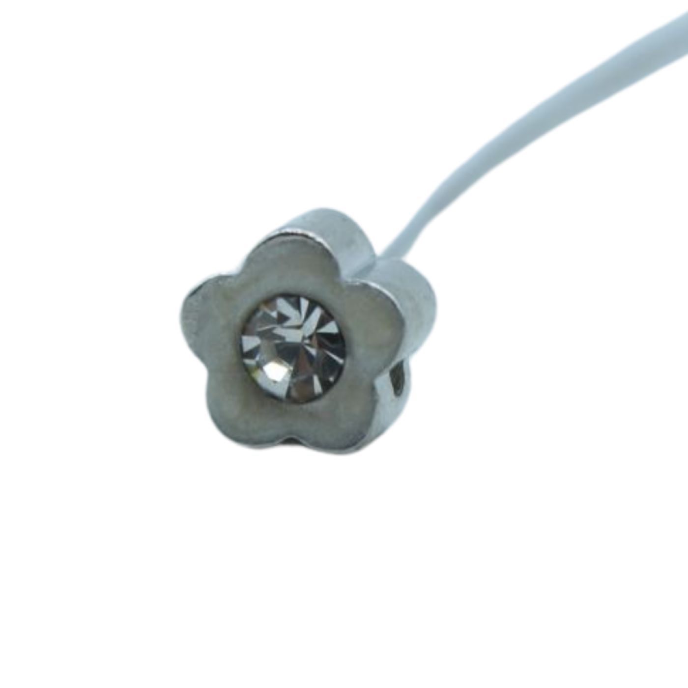 Solid Floral Diamonte Pin – 70mm – Crystal / Antique Silver. 6mm Flower. Plated base metal.