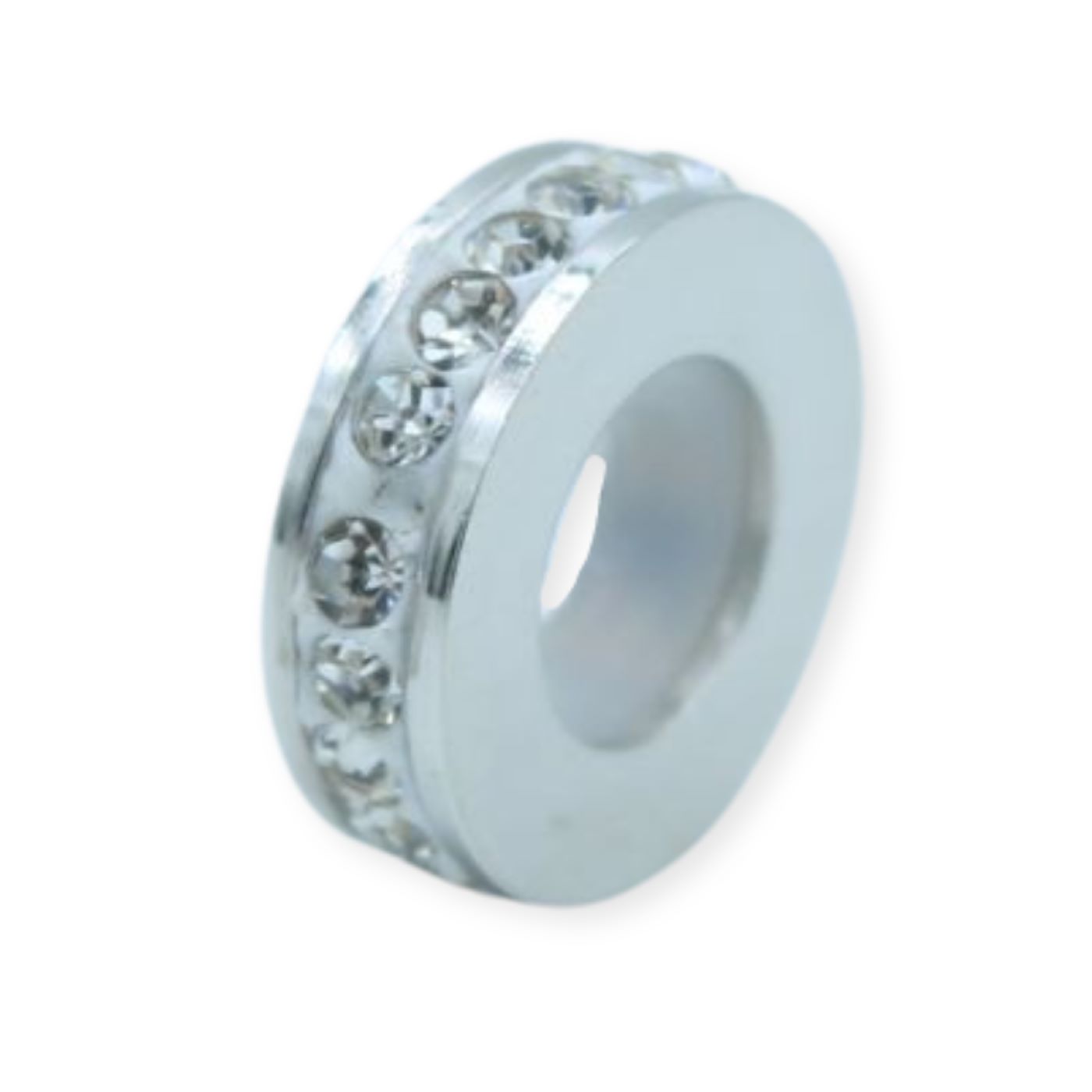 12mm – Pave Stopper Bead – Large Hole – Rhodium. Sterling Silver – Rhodium Plated. 12mm x 4mm Size. 6mm Hole Size. Rubber inserts to stop movement. Crystals set into bead.