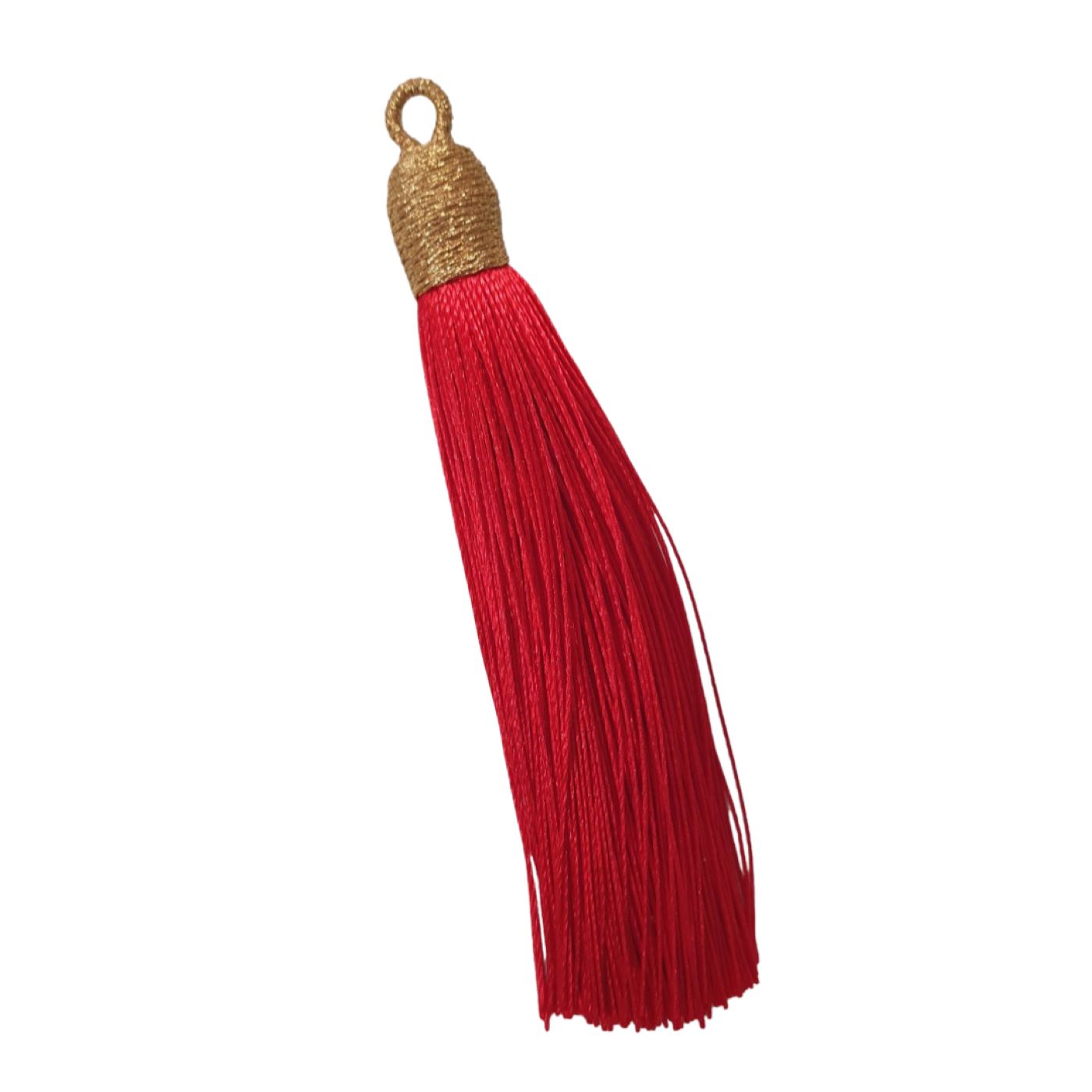 Tassel With Gold Cap – 8cm – Red. Gold Metallic wired tinsel cap.