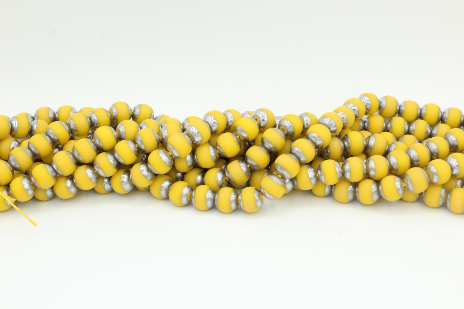 Yellow Opaque Matte / Silver – 10mm – 37cm. Glass Bead. 37cm strand. Metallic Silver capped on outside of bead.